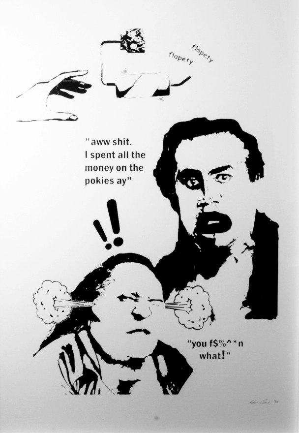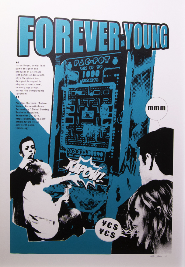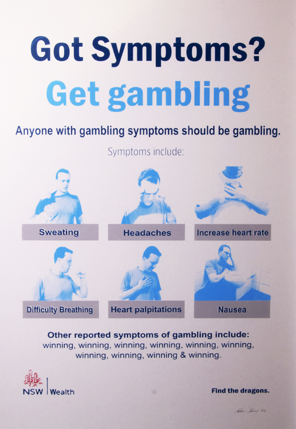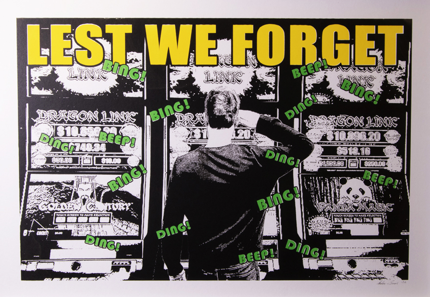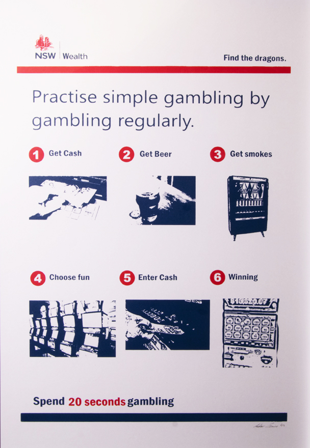 A series of posters, drawings, and photography offer satire and expression in response to the penetration of Australian lifestyle and culture by a gaming industry fuelled on addiction.